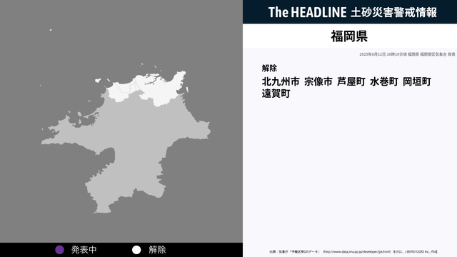 8月12日20時10分、福岡県の土砂災害警戒情報が解除された