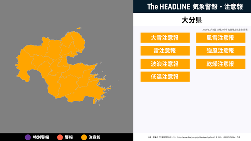 8月10日19時57分、大分地方気象台は、線状降水帯による非常に激しい雨の影響で命に危険が及ぶ災害発生の危険度が急激に高まっていることを発表した。大分県西部では、土砂災害や洪水に厳重に警戒する必要がある。