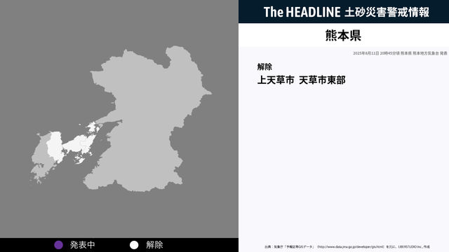 8月11日20時45分、土砂災害の危険性の高まりから熊本県 熊本地方気象台より熊本県に発表されていた、土砂災害警戒情報が解除された。