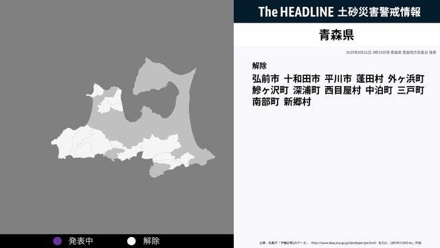8月21日3時15分、土砂災害の危険性の高まりから青森県 青森地方気象台より青森県に発表されていた、土砂災害警戒情報が解除された。