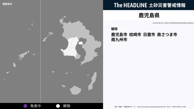 8月22日16時15分、鹿児島県の土砂災害警戒情報が解除された