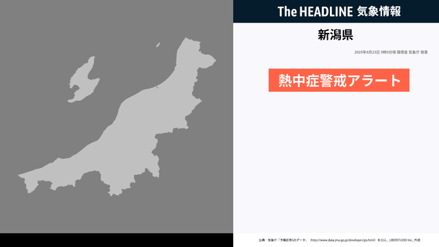 環境省と気象庁は、今日8月23日を対象とした熱中症警報アラートを新潟県に対して発表しました。外出はなるべく避け、室内をエアコン等で涼しい環境にして過ごしてください。