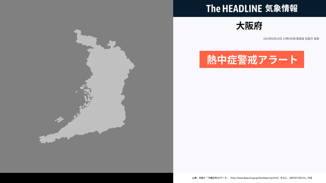 環境省と気象庁は、明日8月24日を対象とした熱中症警報アラートを大阪府に対して発表しました。外出はなるべく避け、室内をエアコン等で涼しい環境にして過ごしてください。