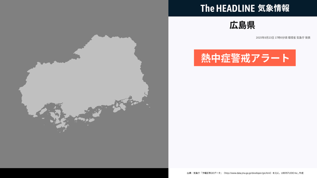 環境省と気象庁は、明日8月24日を対象とした熱中症警報アラートを広島県に対して発表しました。外出はなるべく避け、室内をエアコン等で涼しい環境にして過ごしてください。