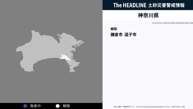 9月5日19時45分、神奈川県の土砂災害警戒情報が解除された