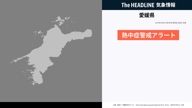 環境省と気象庁は、今日9月6日を対象とした熱中症警報アラートを愛媛県に対して発表しました。外出はなるべく避け、室内をエアコン等で涼しい環境にして過ごしてください。