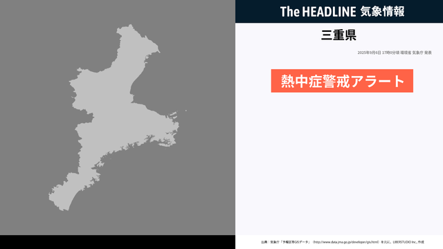 環境省と気象庁は、明日9月7日を対象とした熱中症警報アラートを三重県に対して発表しました。外出はなるべく避け、室内をエアコン等で涼しい環境にして過ごしてください。