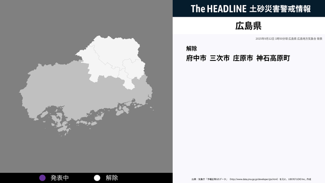 9月12日1時50分、土砂災害の危険性の高まりから広島県 広島地方気象台より広島県に発表されていた、土砂災害警戒情報が解除された。
