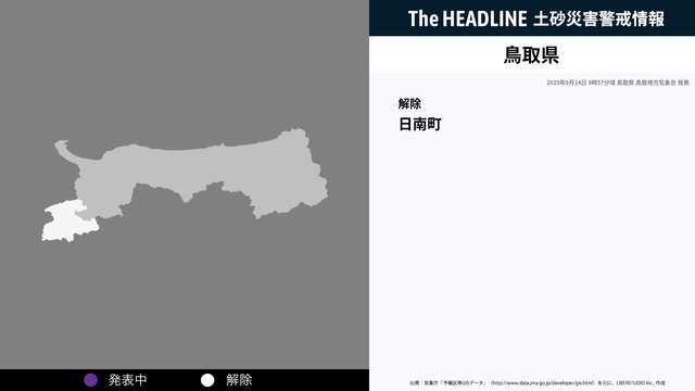 9月14日9時57分、土砂災害の危険性の高まりから鳥取県 鳥取地方気象台より鳥取県に発表されていた、土砂災害警戒情報が解除された。