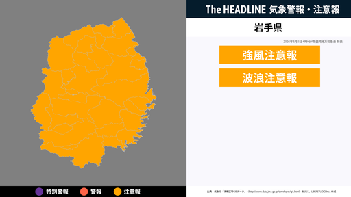 9月21日5時42分、盛岡地方気象台は、岩手県に発表されている警報・注意報の経過、予測、防災上の留意点などを解説するために発表していた気象情報を更新した。