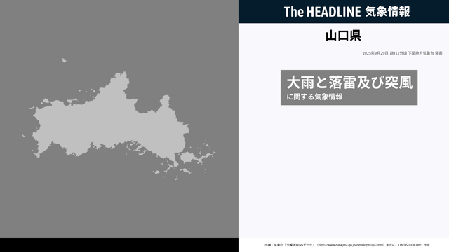9月29日7時11分、下関地方気象台は、山口県に発表されている警報・注意報の経過、予測、防災上の留意点などを解説するために発表していた気象情報を更新した。