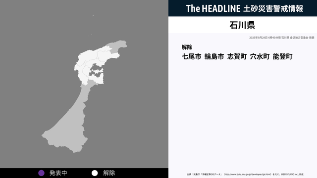 9月29日6時45分、土砂災害の危険性の高まりから石川県 金沢地方気象台より石川県に発表されていた、土砂災害警戒情報が解除された。