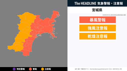 10月1日18時50分、仙台管区気象台は、宮城県に発表されている警報・注意報の経過、予測、防災上の留意点などを解説するために発表していた気象情報を更新した。