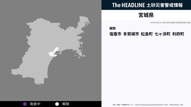 10月1日15時40分、土砂災害の危険性の高まりから宮城県 仙台管区気象台より宮城県に発表されていた、土砂災害警戒情報が解除された。
