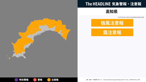 暖かく湿った空気が流れ込むため、高知県では3日夜遅くから4日昼前にかけて、大気の状態が非常に不安定となる見込みです。