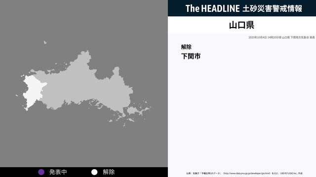 10月4日14時20分、土砂災害の危険性の高まりから山口県 下関地方気象台より山口県に発表されていた、土砂災害警戒情報が解除された。