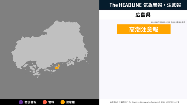 10月7日13時49分、広島地方気象台より広島県に高潮注意報が発表された。