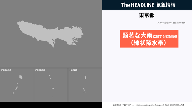 10月9日8時37分、気象庁本庁は、線状降水帯による非常に激しい雨の影響で命に危険が及ぶ災害発生の危険度が急激に高まっていることを発表した。伊豆諸島南部では、土砂災害や洪水に厳重に警戒する必要がある。