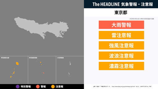 10月12日11時46分、気象庁は、東京都(伊豆諸島)に発表されている警報・注意報の経過、予測、防災上の留意点などを解説するために発表していた気象情報を更新した。