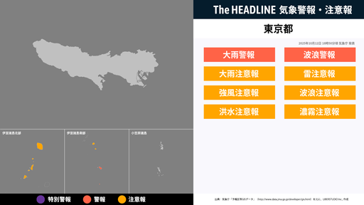 10月12日10時5分、土砂災害の危険性の高まりから東京都 気象庁より東京都に発表されていた、土砂災害警戒情報が解除された。