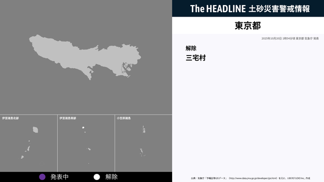 10月20日1時54分、土砂災害の危険性の高まりから東京都 気象庁より東京都に発表されていた、土砂災害警戒情報が解除された。