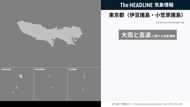 10月30日5時50分、気象庁は、東京都(伊豆諸島・小笠原諸島)に発表されている警報・注意報の経過、予測、防災上の留意点などを解説するために発表していた気象情報を更新した。