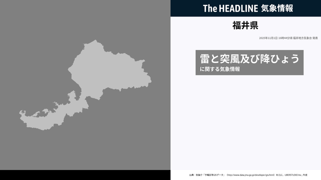11月1日16時44分、福井地方気象台は、福井県に発表されている警報・注意報の経過、予測、防災上の留意点などを解説するために発表していた気象情報を更新した。