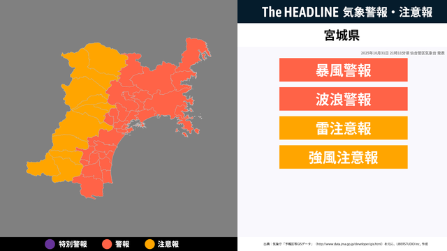10月31日21時11分、仙台管区気象台より宮城県に暴風警報・波浪警報などが発表された。対象の市区町村にお住まいの方は、最新の情報を入手しつつ、避難や警戒など適切な行動を取る必要がある。