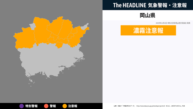 11月2日4時10分、岡山地方気象台より岡山県に濃霧注意報が発表された。