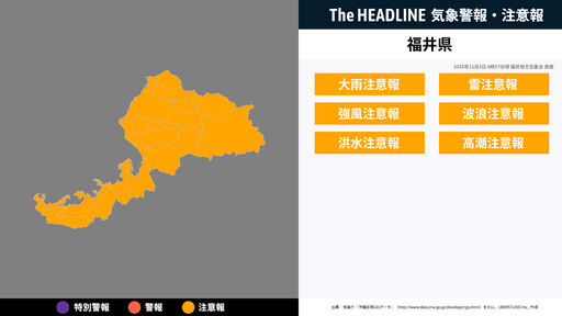 11月3日4時57分、福井地方気象台は、福井県に発表されている警報・注意報の経過、予測、防災上の留意点などを解説するために発表していた気象情報を更新した。