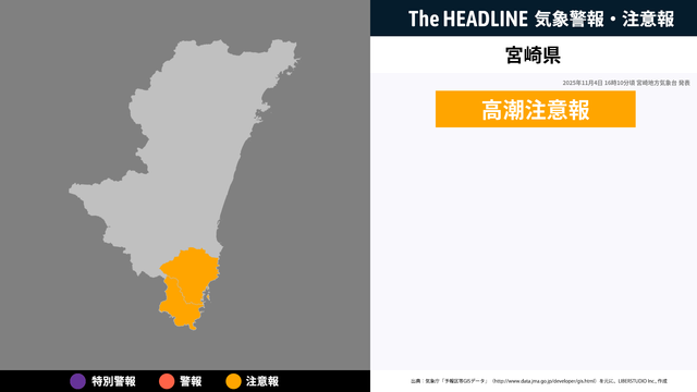 11月4日16時10分頃、宮崎県に高潮注意報が発表