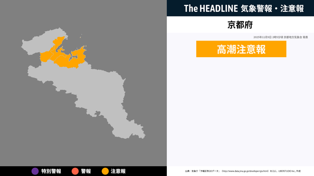 11月9日2時5分、京都地方気象台より京都府に高潮注意報が発表された。