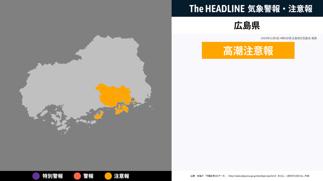 11月9日4時6分、広島地方気象台より広島県に高潮注意報が発表された。