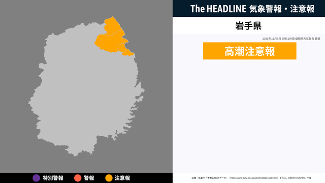 11月9日9時51分頃、岩手県に高潮注意報が発表