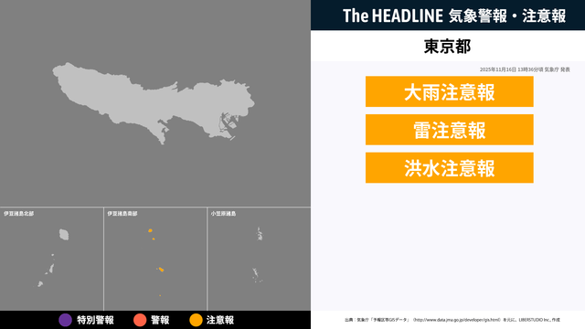 11月16日13時36分頃、東京都に大雨注意報・雷注意報などが発表