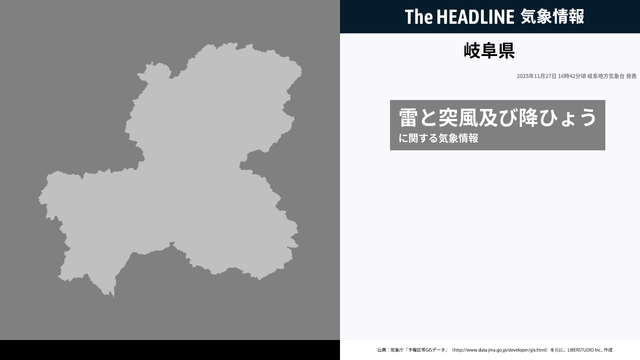 11月27日16時42分、岐阜地方気象台は、岐阜県に発表されている警報・注意報の経過、予測、防災上の留意点などを解説するために発表していた気象情報を更新した。