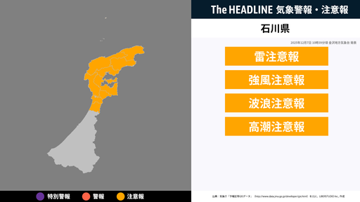 12月7日11時0分、金沢地方気象台は、石川県に発表されている警報・注意報の経過、予測、防災上の留意点などを解説するために雷と突風及び降ひょうに関する気象情報を発表した。