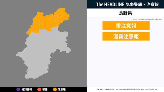 12月8日4時19分頃、長野県に雷注意報・濃霧注意報が発表