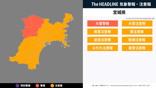 12月12日7時51分、仙台管区気象台は、宮城県に発表されている警報・注意報の経過、予測、防災上の留意点などを解説するために大雪に関する気象情報を発表した。