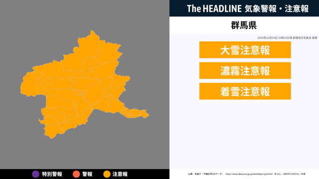 12月14日22時18分頃、群馬県に大雪注意報・濃霧注意報などが発表