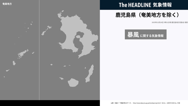 12月26日5時11分、鹿児島地方気象台は、鹿児島県(奄美地方を除く)に発表されている警報・注意報の経過、予測、防災上の留意点などを解説するために発表していた気象情報を更新した。