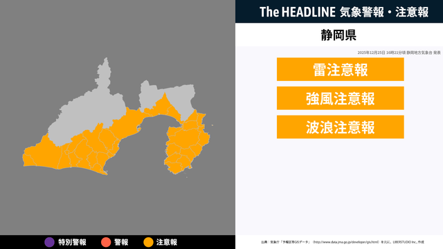 12月25日16時21分、静岡地方気象台より静岡県に雷注意報・強風注意報などが発表された。