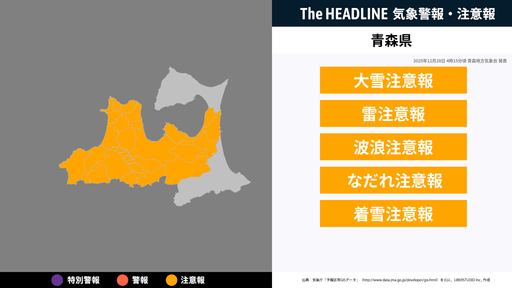 12月28日4時43分、青森地方気象台は、青森県に発表されている警報・注意報の経過、予測、防災上の留意点などを解説するために発表していた気象情報を更新した。