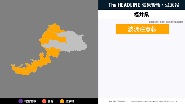12月30日16時3分、福井地方気象台より福井県に波浪注意報が発表された。