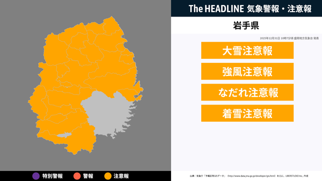 12月31日10時7分頃、岩手県に大雪注意報・強風注意報などが発表