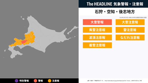 1月2日5時12分、札幌管区気象台は、石狩・空知・後志地方に発表されている警報・注意報の経過、予測、防災上の留意点などを解説するために発表していた気象情報を更新した。