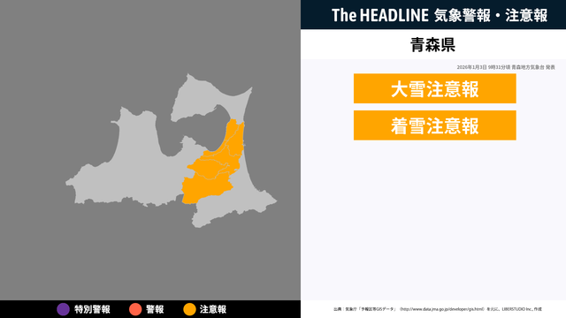 1月3日9時31分頃、青森県に大雪注意報・着雪注意報が発表