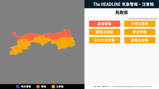 1月11日5時25分、鳥取地方気象台は、鳥取県に発表されている警報・注意報の経過、予測、防災上の留意点などを解説するために発表していた気象情報を更新した。