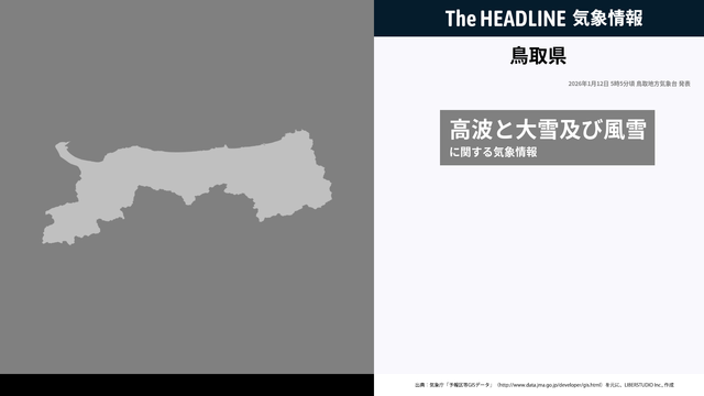 1月12日5時5分、鳥取地方気象台は、鳥取県に発表されている警報・注意報の経過、予測、防災上の留意点などを解説するために発表していた気象情報を更新した。