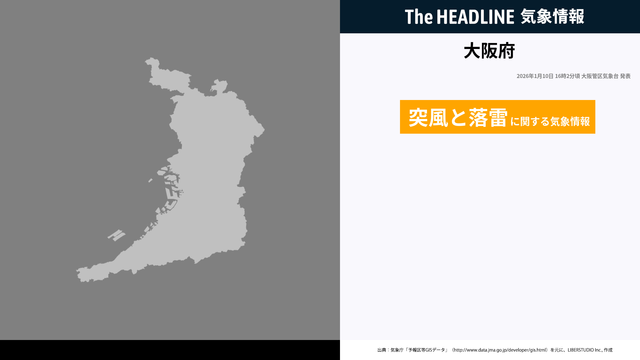 1月10日16時2分、大阪管区気象台は、大阪府に発表されている警報・注意報の経過、予測、防災上の留意点などを解説するために発表していた気象情報を更新した。